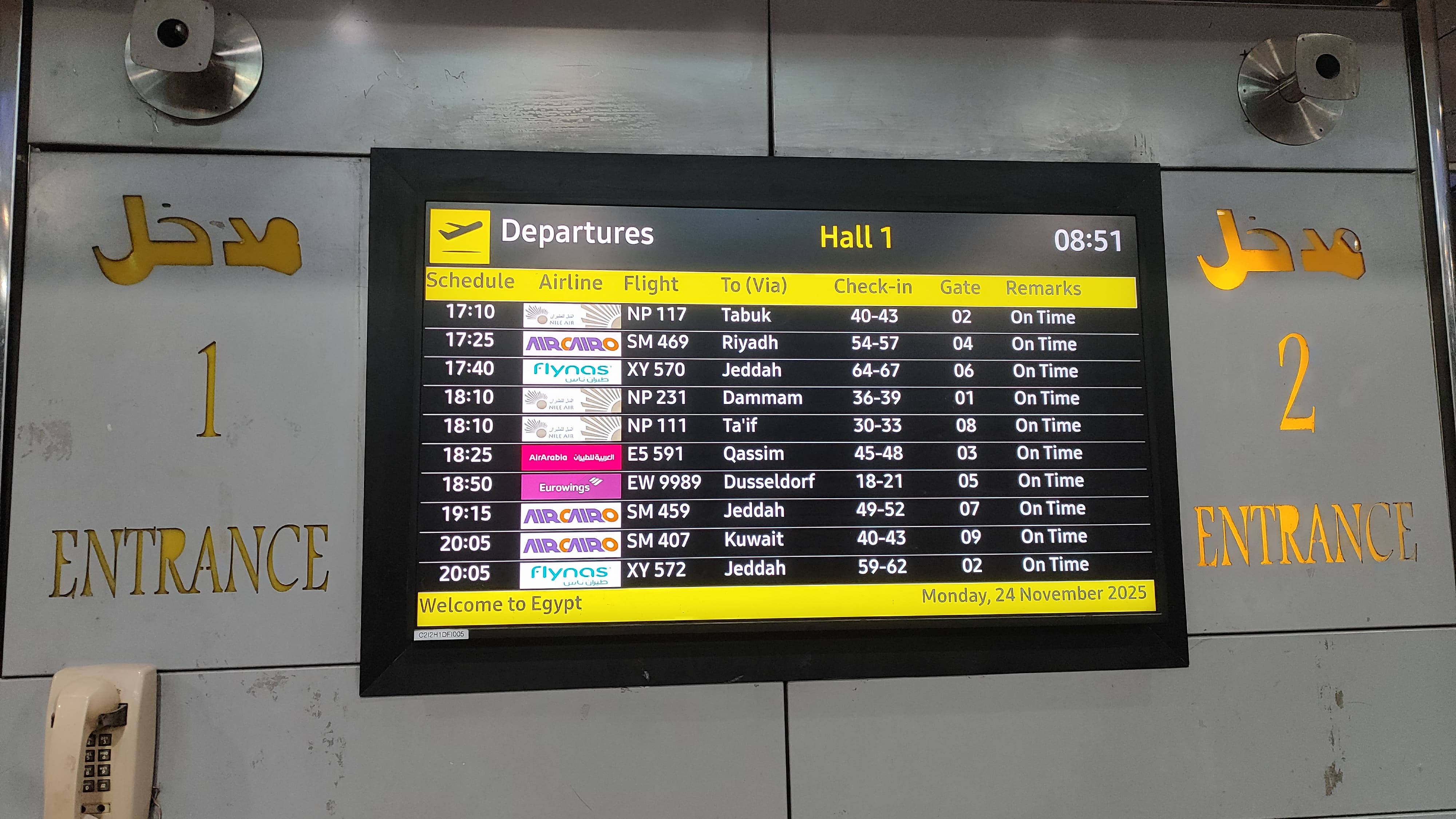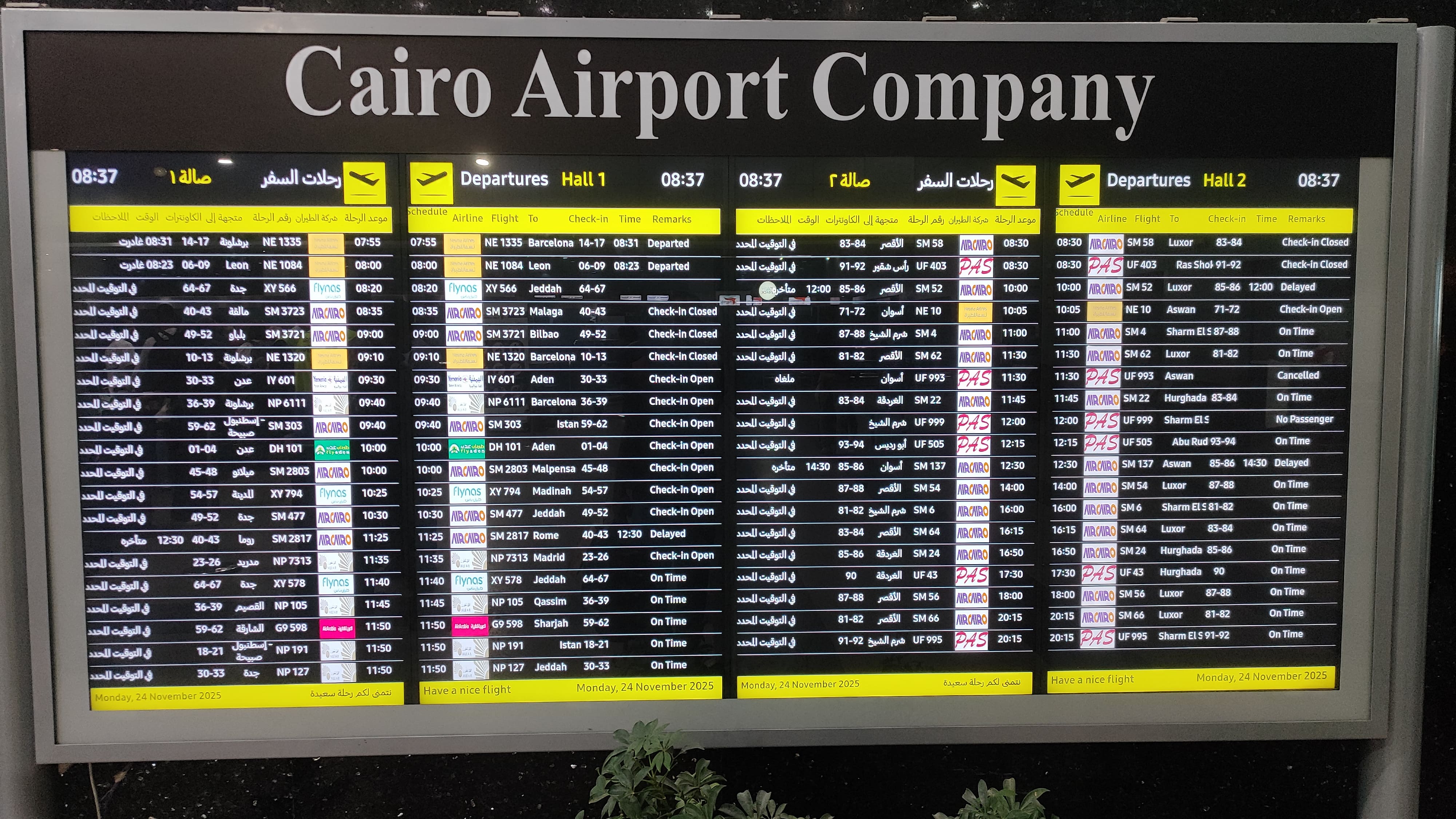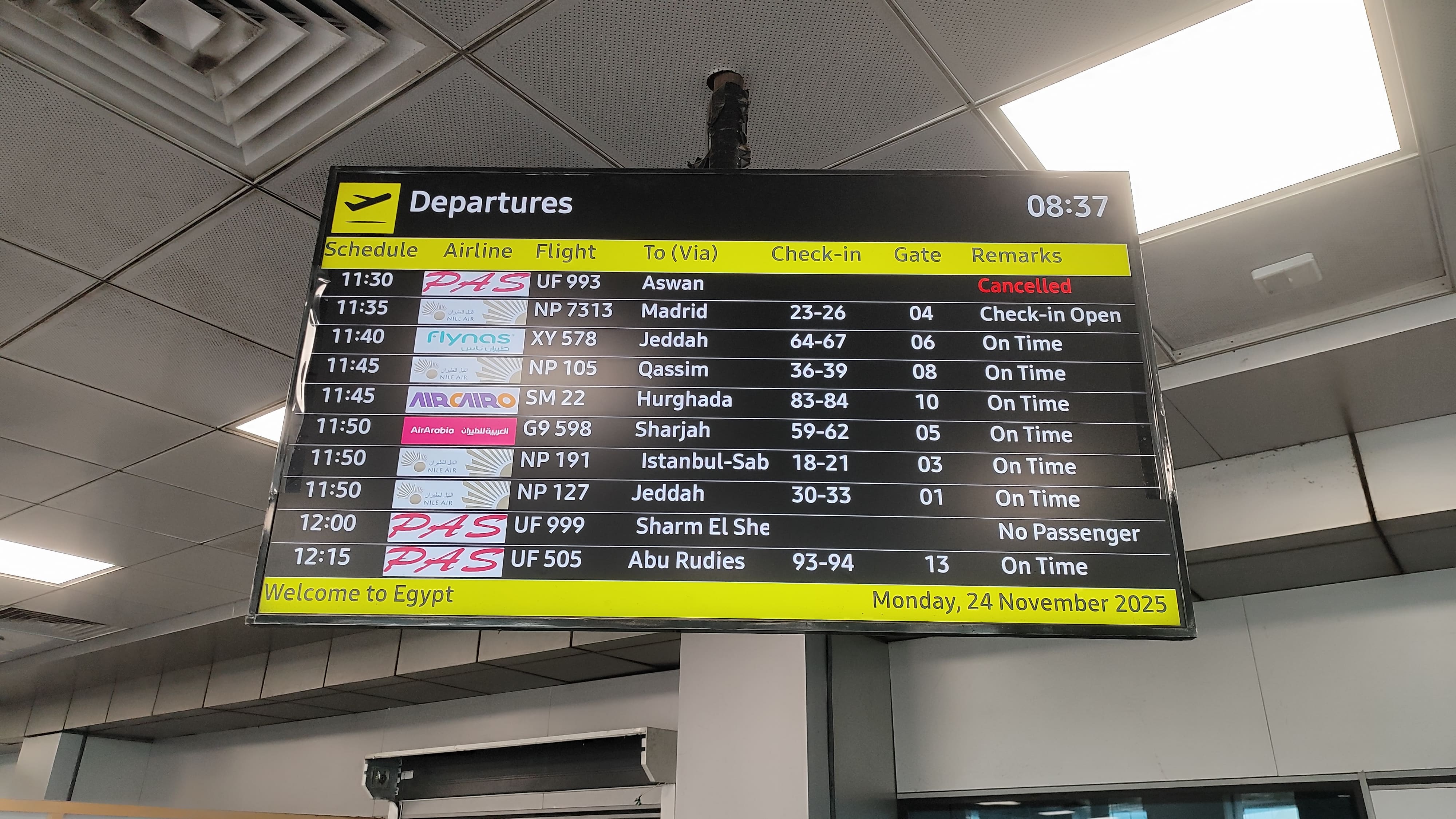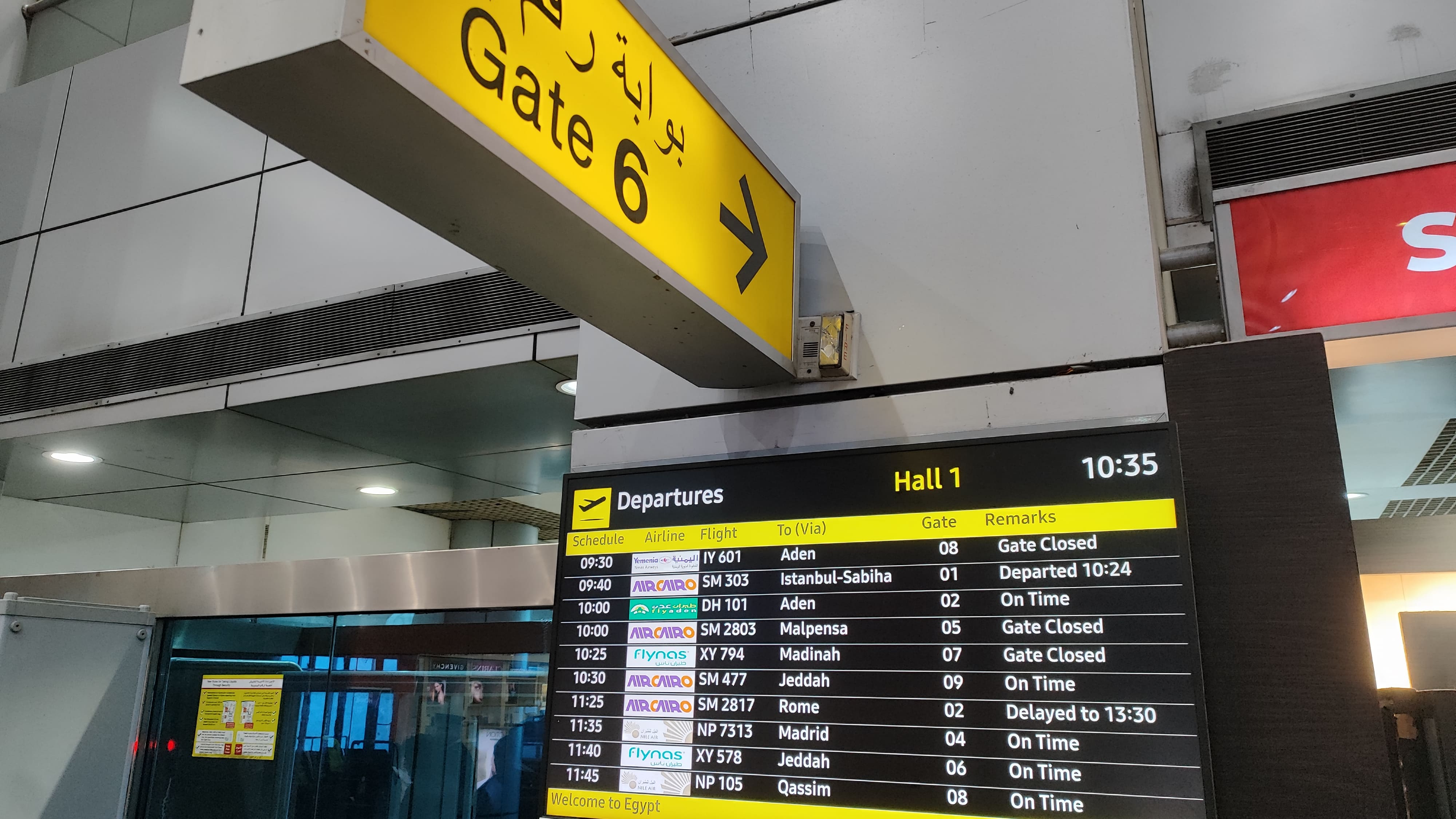 Got up early in the morning, drank some tea, and then got ready. Packed my bags, checked-out from Holy Sheet hostel, walked to Tahrir bus station. Got into bus 356, got down at Cairo airport bus station, took the free airport shuttle bus to reach Terminal 1.